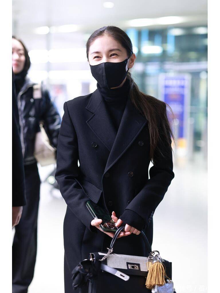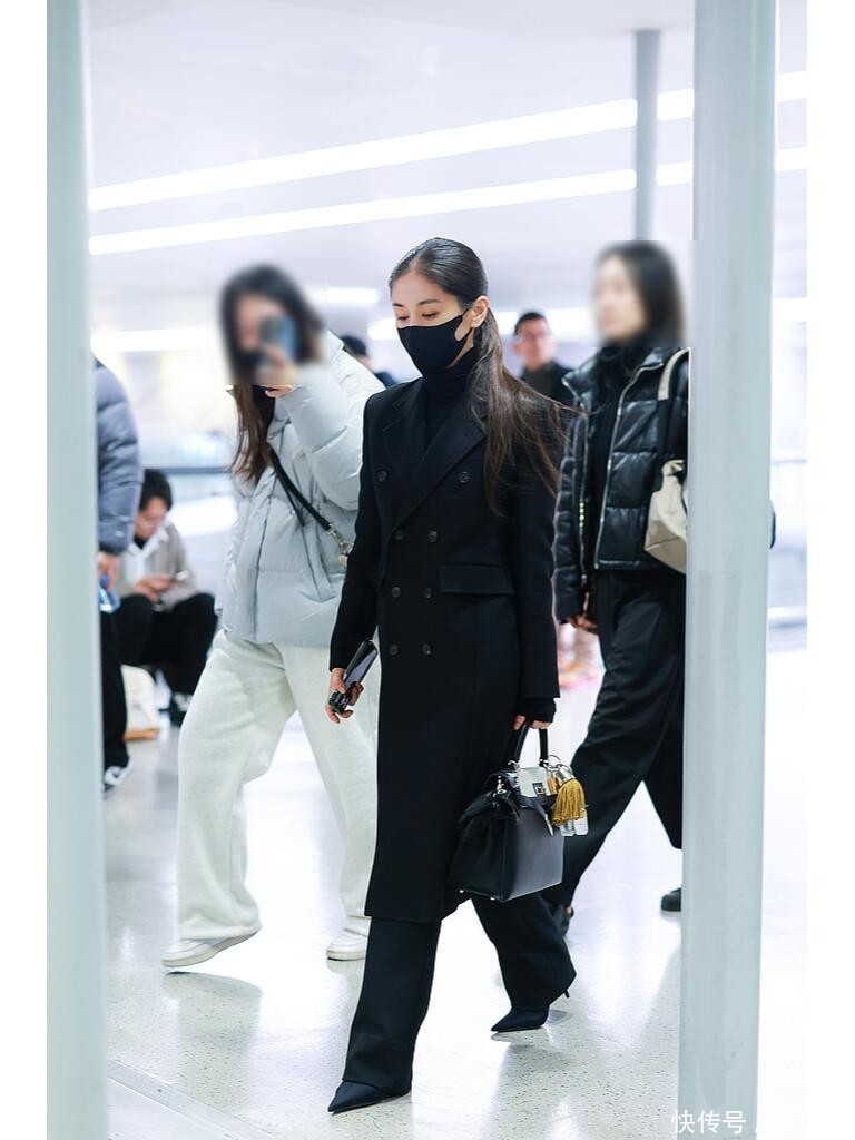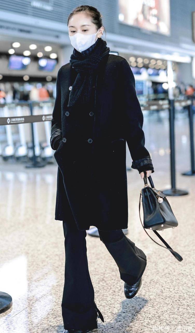 身上所穿的黑大衣和裤子面料垂顺感很强,不仅有质感,穿身上也十分舒适。为了增高、凸显干练,脚上可搭一双尖头高跟鞋,走在人群中气场全开。